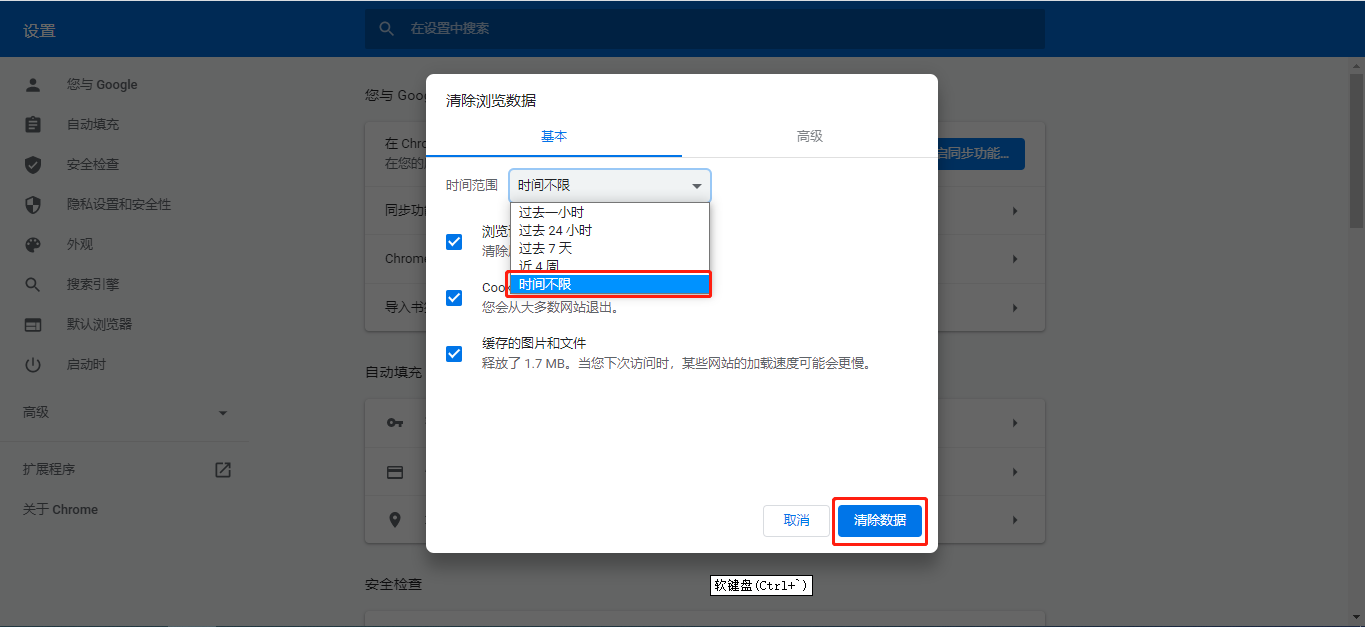 步骤一:同时按下快捷键CTRL+SHIFT+DEL 或 在浏览器输入网址:chrome://settings/clearBrowserData